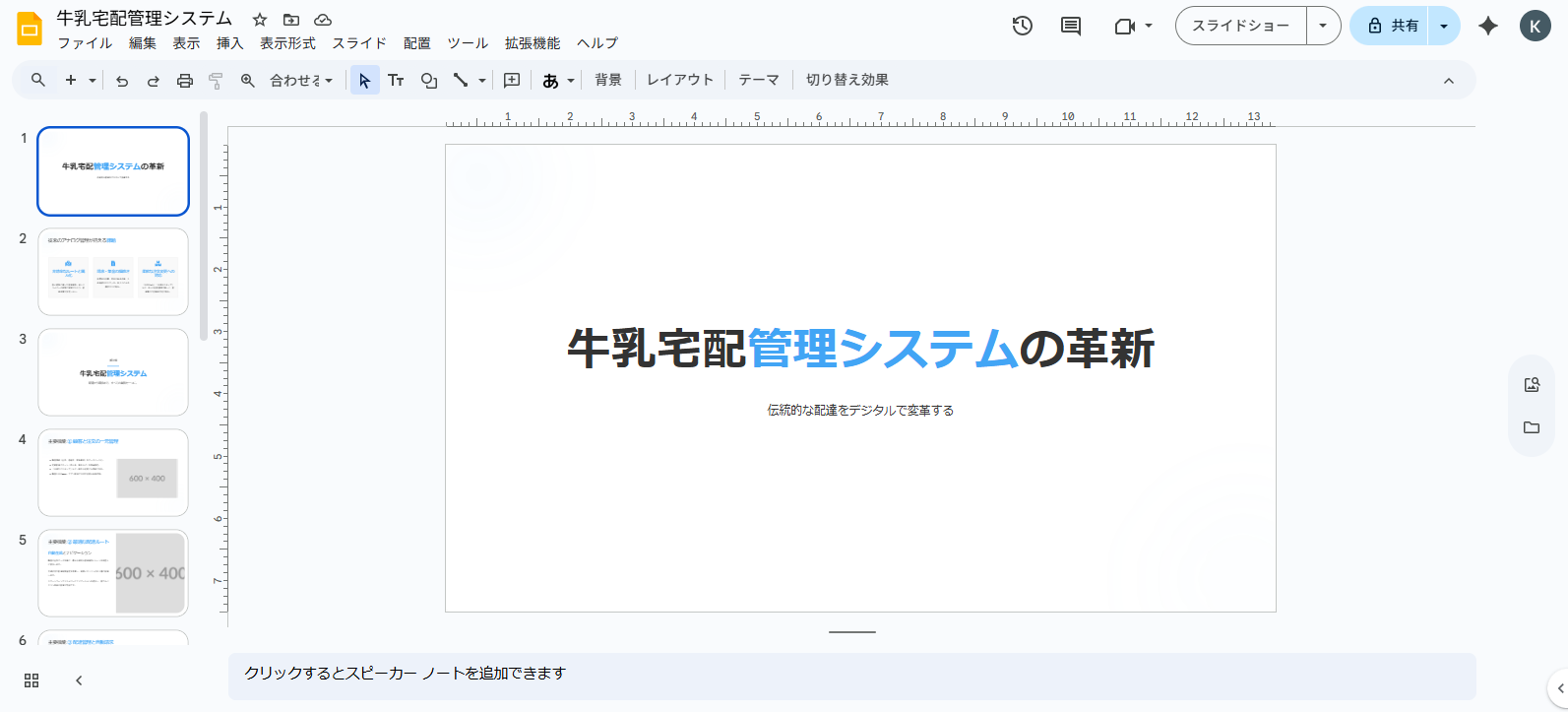 今回は、弊社で開発している牛乳宅配システム「MILK.CLOUD」のひな形になるようなプレゼン資料を出力してもらいました。最初はざっくりとした指示を与えて、プレゼン資料を作成してもらいます。