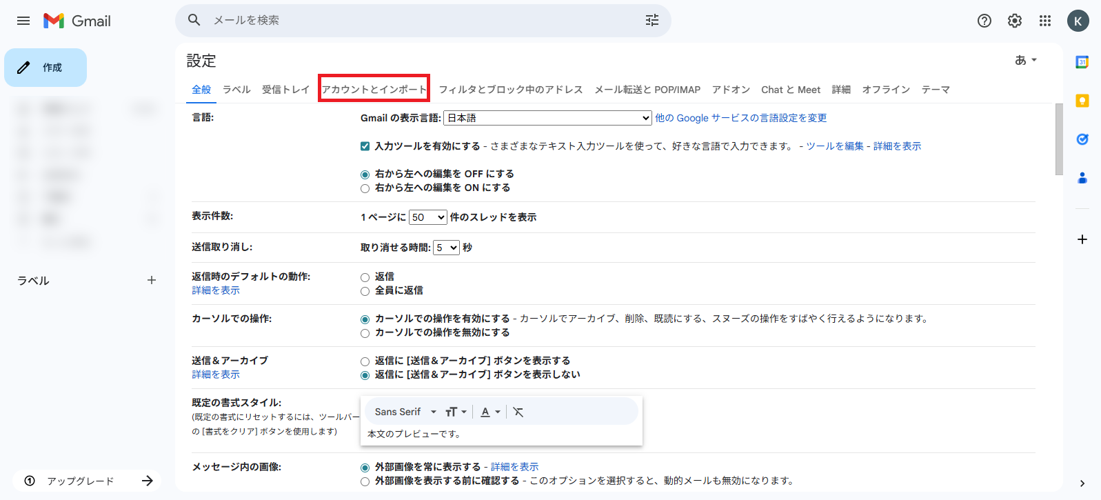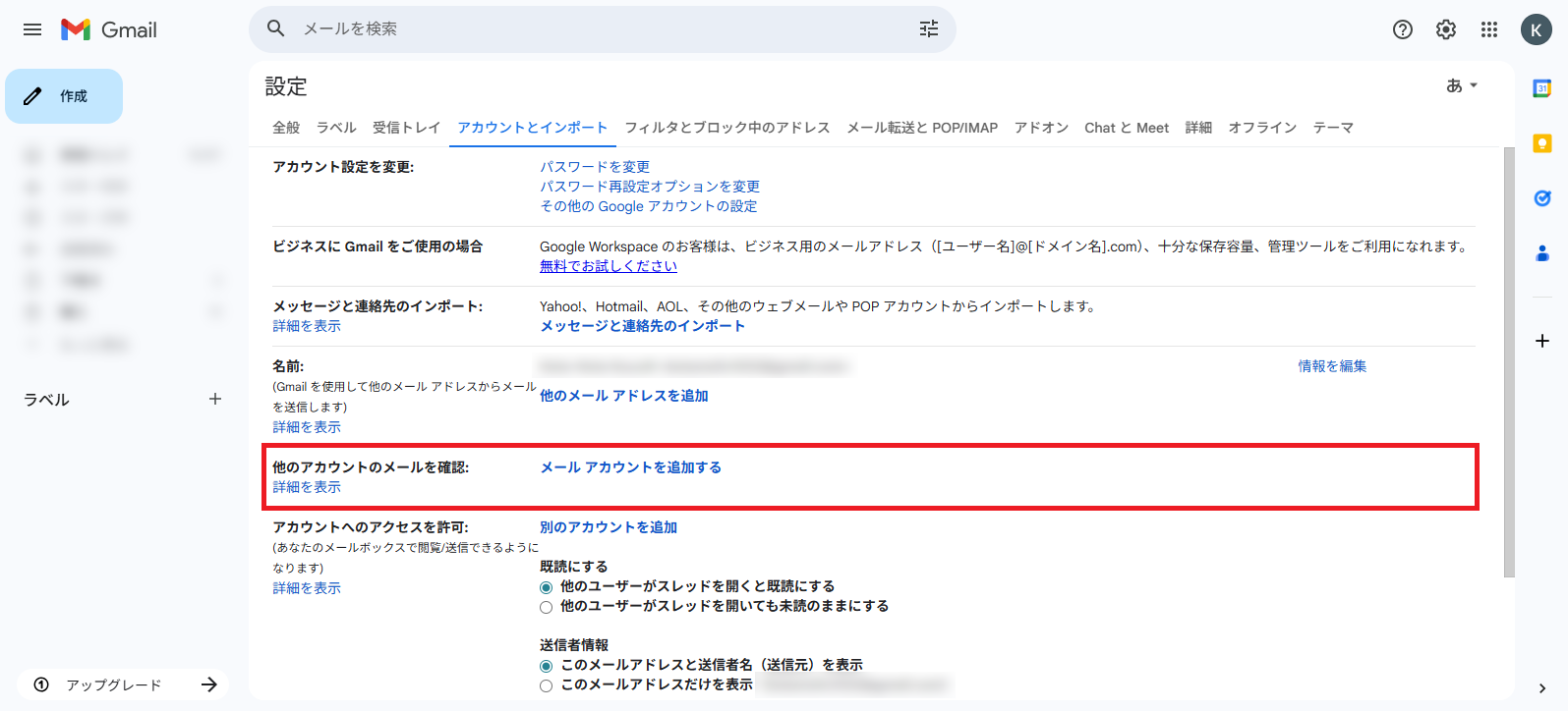 その後、「アカウントとインポート」をクリックし、その中にある項目の「他のアカウントのメールを確認」の場所を確認してください。
